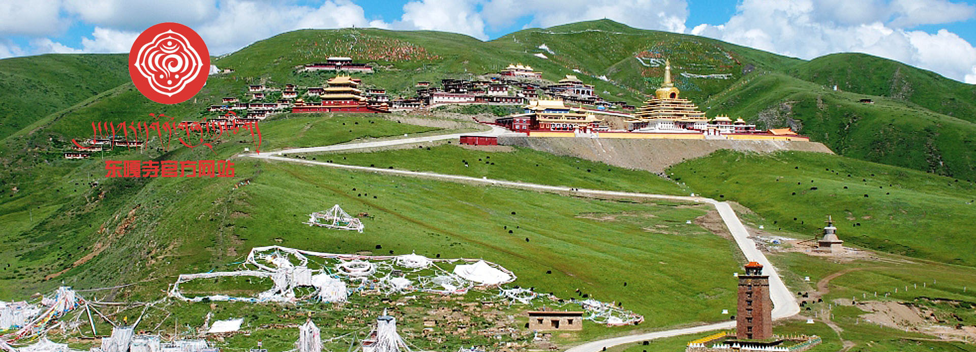 在圣者观世音菩萨所化之净土--雪域西藏的东方,有处圣洁密域叫瓦须色达,这里就是第二佛陀邬金莲花生大师和吡卢遮那大译师等无量大智成就者亲临加持过的圣地。在这神奇的土地上孕育着一片美丽富饶的草原,传说有块状若骏马的黄金在草原下不停地纵横驰骋,因此人们便将这里称为金马草原。藏传佛教宁玛派著名寺院--东方胜者东嘎显密成就院(东嘎寺)就座落在这金马草原的东嘎山上。东嘎,在藏语中是白色海螺的意思,东嘎寺因此而得名。