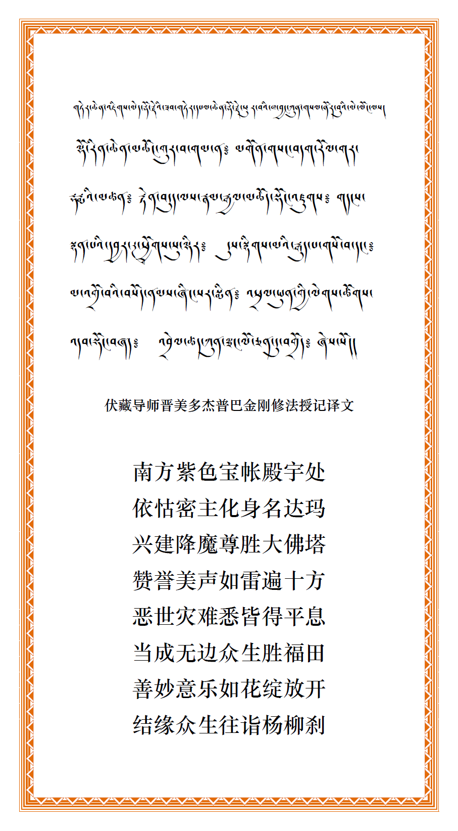 莲花生大士在许多佛经中都有授记,如伏藏大师嘎瓦夏达在空行授记中说道:"善哉!此地乃胜者观世音菩萨之所化地,是祜主八大如来宏愿之所成地,此地空界宝瓶之中央是吉祥赞巴拉,财源佛母等众多财神之聚集地,在如此一切财富均具足之宝瓶般的地方,兴建一座菩提塔,将来恶魔烦恼盛重时,此塔定能平息一切灾难。"另外,在伏藏大师晋美多杰的普巴金刚修法中是这样授记的:"在南方如同黄色宝帐般的神山附近,有一金刚手的化身,名为达玛者,将兴建一座降魔塔,人们赞叹之声如同雷鸣遍布十方,五浊恶世所有灾难均能伏息,此塔当能成为无边众生的最胜福田,与之结缘的众生暂时能吉祥如意,究竟能得到最胜安乐,暂时与究竟的一切利益和安乐如同莲花一样盛开,凡与此塔结缘的众生均能往生杨柳刹。">>>> 详情